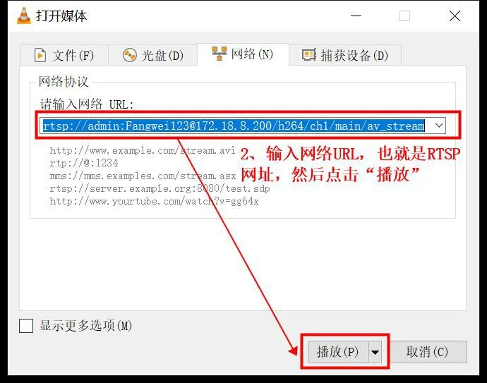Click “Open Network Stream”, enter the network URL, which is the RTSP address, and then click “Play” to verify that the video stream can be displayed normally.
